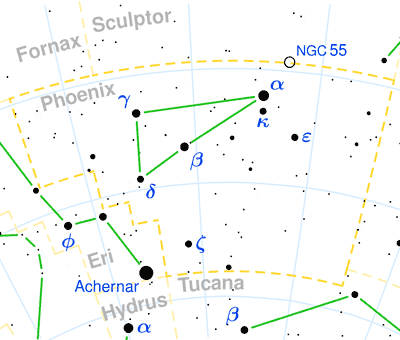 30 and -90 degreesThe constellation Phoenix, the phoenix, is located in the southern hemisphere of the sky. It is completely visible in latitudes south of 32 degrees from September through November, all though it is very low in the sky for anyone north of 40 degrees. It is a medium-sized constellation occupying an area of 469 square degrees. This makes it the 37th largest constellation in the night sky. It is bordered by Fornax and Sculptor to the north, Grus to the west, Tucana to the south, touching on the corner of Hydrus to the south, and Eridanus to the east and southeast. It is one of four constellations known as the “Southern Birds,” along with Grus, Pavo, and Tucana.