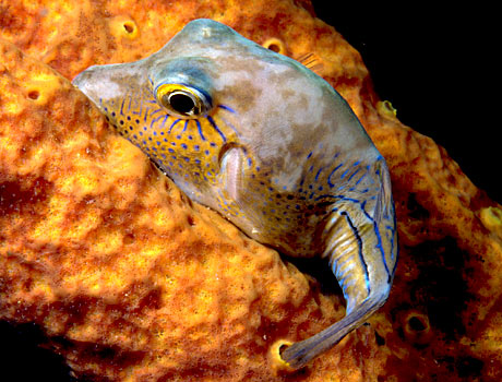 The Caribbean sharpnose puffer (Canthigaster rostrata) is a tiny pufferfish with beautiful coloration. It is native to the western Central Atlantic Ocean from the coast of South Carolina to Venezuela, including Bermuda, the Gulf of Mexico. and the Caribbean Sea. Like all pufferfishes, it has the ability to inflate its body with water when threatened. This makes it suddenly appear larger which can surprise and confuse predators. This small species grows to a maximum size of about 5 inches (12 centimeters).